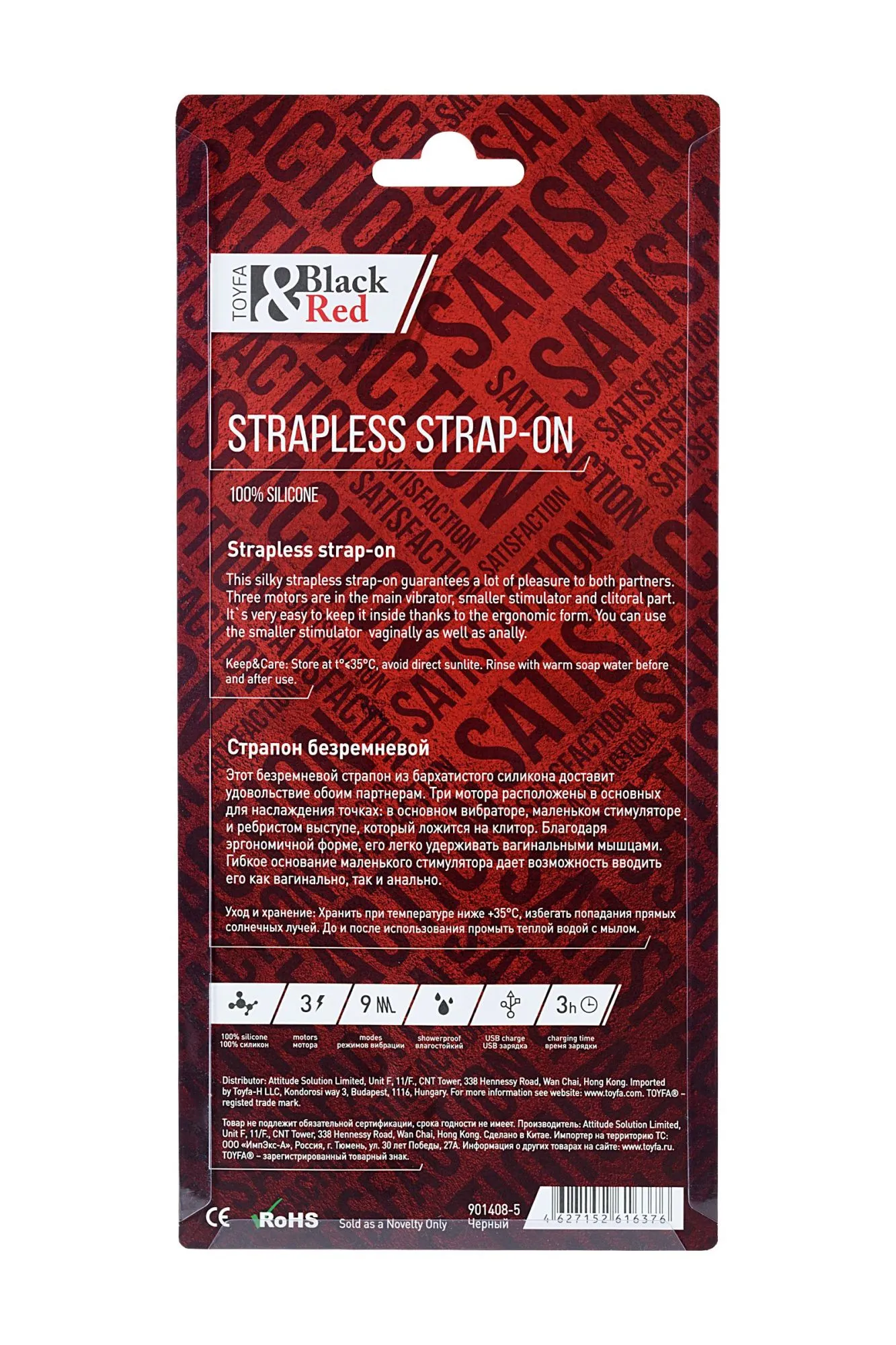 —Безремневой страпон Black & Red by TOYFA с вибрацией, силикон, черный