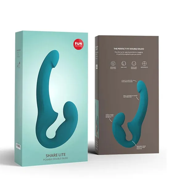 Рабочая часть Share Lite имеет анатомическую форму, приближенную к реальному пенису – выраженная головка и упругий кончик, который упирается в зону G. Длина рабочей части 16,5 см. Вторая часть предназначена для ласк активного партнера, длина 15,5 см. Изгиб и выпуклый рельеф удерживает игрушку внутри и соприкасается с двумя эрогенными точками активной партнерши – клитором и точкой «G».