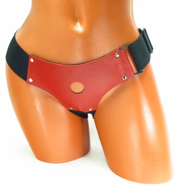 Трусики для страпона, изготовлены из кожи. Крепятся при помощи широких  эластичных ( 5 см) лент. Размер легко меняется при помощи застежки. Диаметр отверстия для страпона - 2,5 см