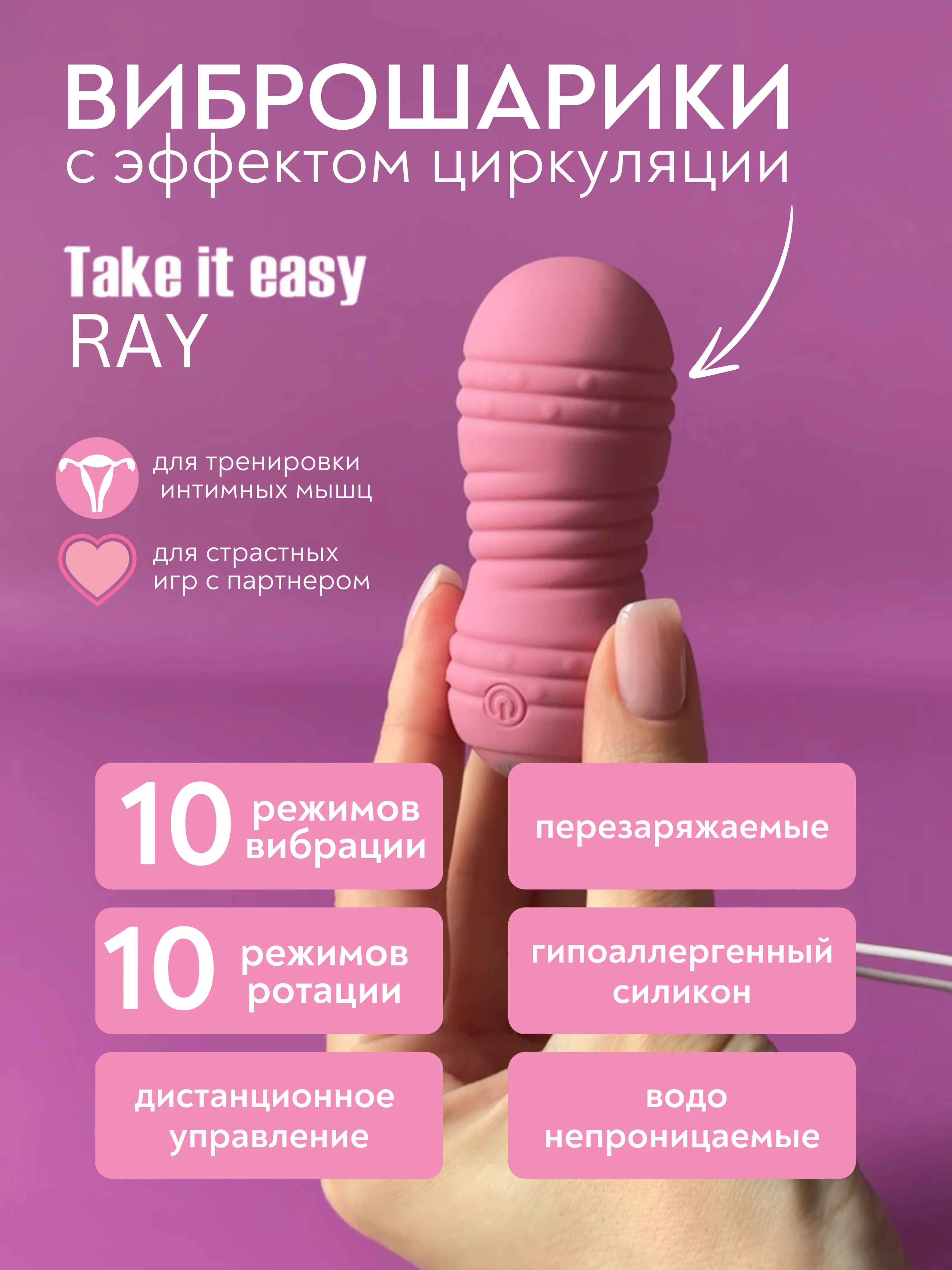 Виброшарики Ray на пульте дистанционного управления выполнены из гипоаллергенного силикона и имеют 10 режимов вибрации и циркуляции. Отлично подойдут как для тренировок мышц тазового дна, так и для игр соло или с партнером. Благодаря степени водонепроницаемости IPX7 игрушку можно использовать в ванне. Веревочка в основании шариков позволит легко извлечь их после использования. Виброшарики перезаряжаемые и идут вместе с USB-кабелем в комплекте. Игрушка не издает больше 60 дБ и имеет мощный моторчик в 12500 об/мин. Пульт ДУ выполнен из пластика с покрытием soft-touch (не содержит фталаты) и работает от 2-ух ААА батареек. Пульт способен работать на расстоянии до 12 метров (при отсутствии препятствий в виде стен и дверей). Длина шариков: 8,3 см. Ширина шариков: 3,4 см. Длина пульта: 6 см. Ширина пульта: 3,6 см