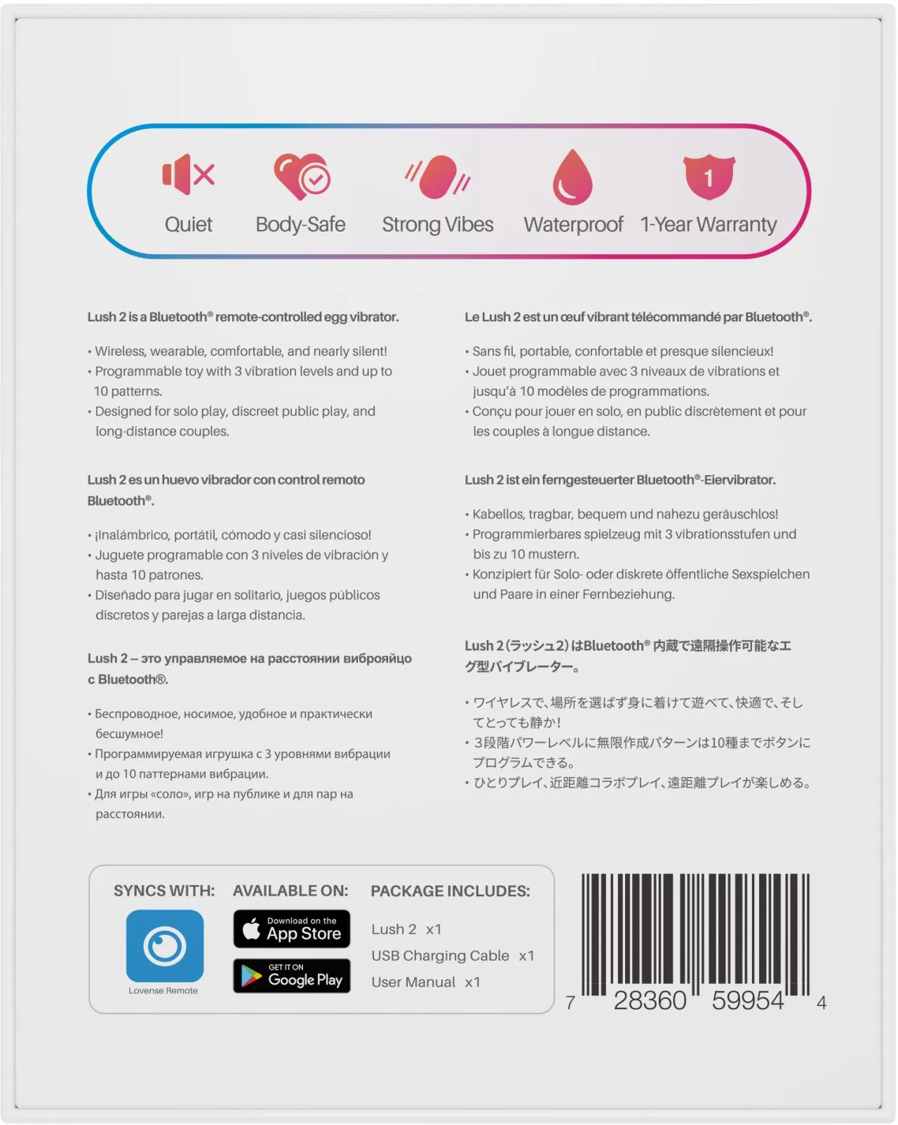 Lovense Lush 2, USB-кабель для зарядки, руководство пользователя, руководство по быстрой установке.