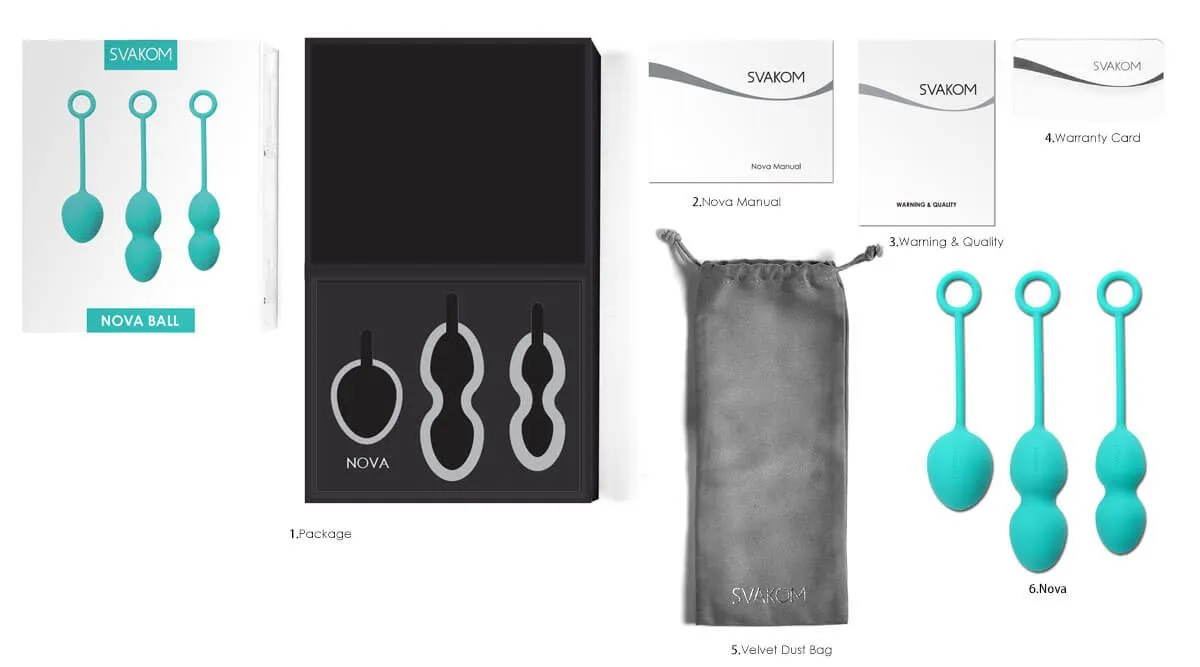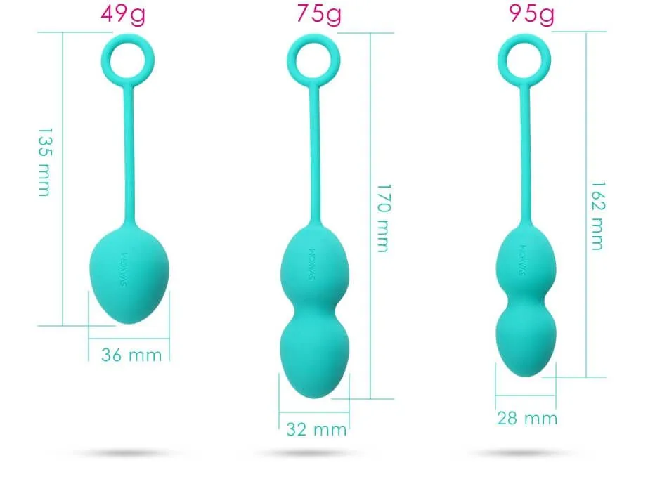 Вагинальные шарики Svakom Nova Ball разработаны для упражнений Кегеля. Набор включает в себя три различных шарика с разными размерами и разным весом. Каждый шарик сделан из 100% медицинского силикона и оснащен специальным колечком для легкого извлечения. Внутри каждого шарика есть подвижный металлический шарик, который будет создавать вибрации при каждом Вашем движении. Силиконовые шарики будут выскальзывать, однако под воздействием этих небольших вибраций Ваши мышцы будут сокращаться и препятствовать их выпадению. Дизайн шариков учитывает анатомию женского тела, что делает этот набор очень комфортными и удобными в использовании.