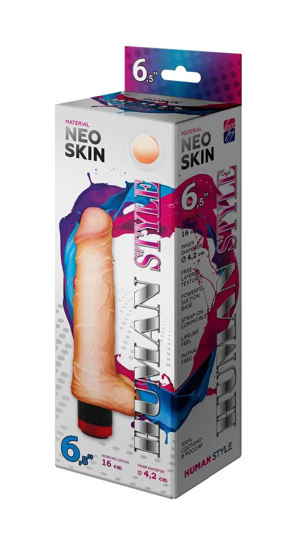 Реалистичный вибромассажер телесного цвета. Имеет форму члена с ярковыраженной головкой. Необычайно приятный, рельефный, выполненный из материала «Неоскин» , передающий эффект мягкой реалистичной текстуры кожи, не имеет швов. Характеристика: общая длина– 21,5 см, рабочая длина- 16 см, максимальный диаметр- 4,2 см, работает от 2АА батареек (нет в комплекте). Упаковка- картонная коробка с принтом.
