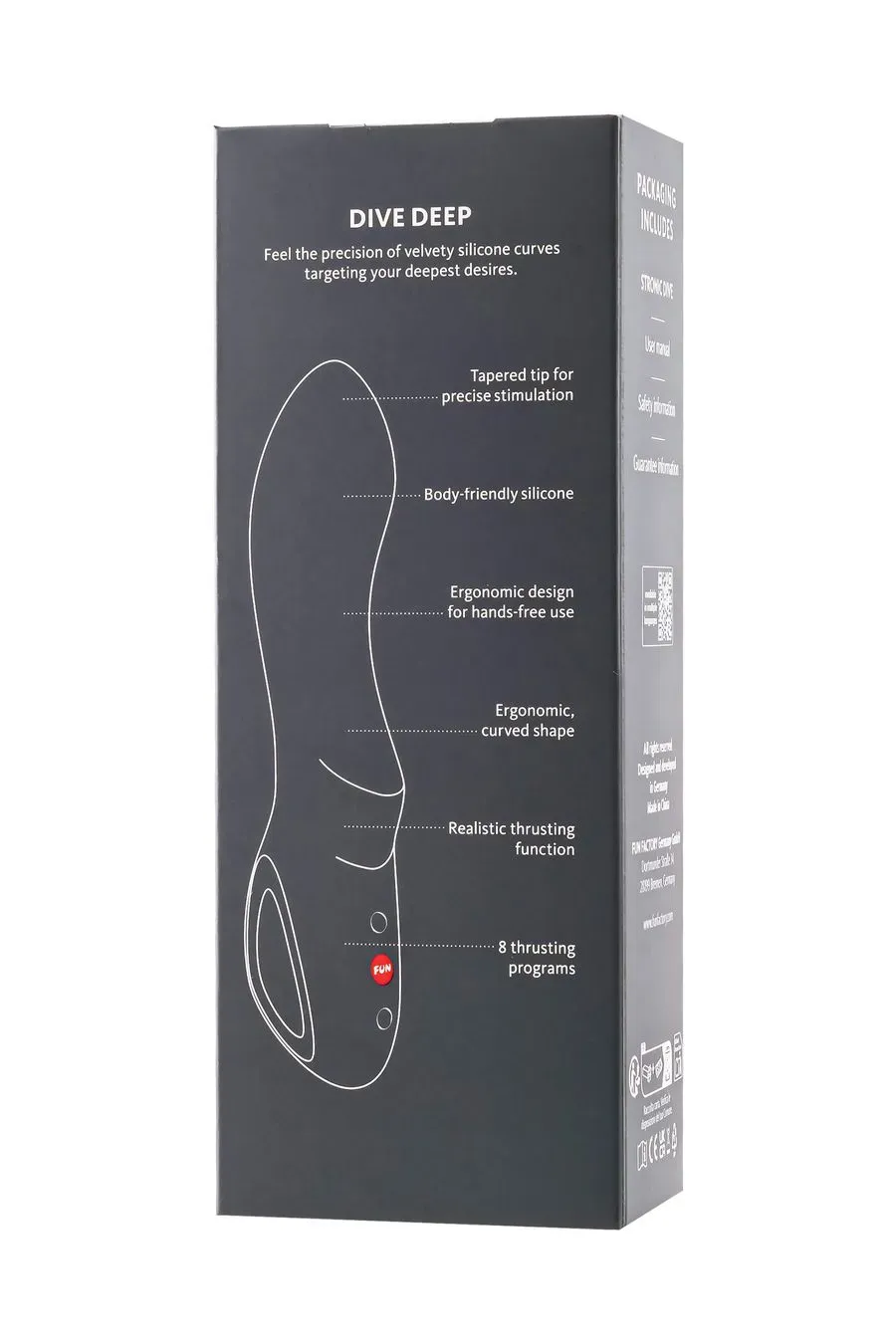 Заостренный наконечник STRONIC DIVE и эргономичный изогнутый дизайн точно попадают в вашу точку G, пробуждая глубокие желания. Бархатистая силиконовая текстура скользит по коже, обеспечивая настолько мягкие ощущения, что вы утонете в чистом экстазе. Заряжается через USB-C (в компалект не входит) и водонепроницаем (IPX7), поэтому этот пульсатор всегда готов к вашему следующему приключению — будь то в душе, ванне или в дороге. Будьте смелыми, будьте игривыми и узнайте, что приготовил для вас STRONIC DIVE!