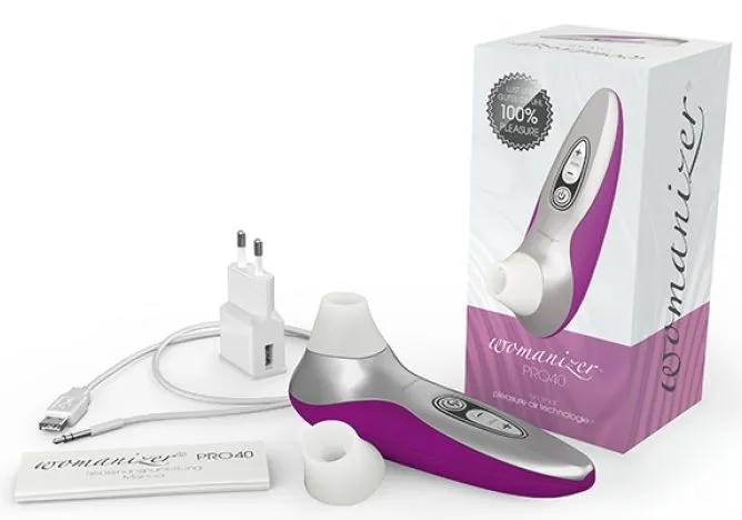 Womanizer Pro 40 сделан из пластика и силикона - самые безопасные материалы доступные в секс игрушках. Оба материала - не пористые, не содержат латекс или свободный фталаты, могут легко стерилизоваться. Пластмасса может протираться спиртосодержащими растворами, сменная силиконовая головка может подвергаться кипячению. Если по какой-либо причине головка повредится, в комплекте есть замена. Для регулярной очистки оптимально использовать мыльный раствор, просто избегайте слишком большого увлажнения. Компания рекомендует использовать хлопковый тампон или вату, чтобы убрать барокамеру (в области всасывания), т.к. это место труднодоступно.