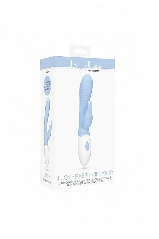 Juicy - вибромасссажер кролик. Эта игрушка имеет особую эргономичную форму с плавным изгибом, волнообразной текстурой под головкой и клиторальный отросток в виде зайчика для наиболее яркой стимуляции. Вибромассажер имеет два мощных двигателя, по одному в каждом отростке, имеющих 10 функций вибрации, способной достигать 7500 оборотов в минуту, при этом уровень звука не превышает 50 дБ.