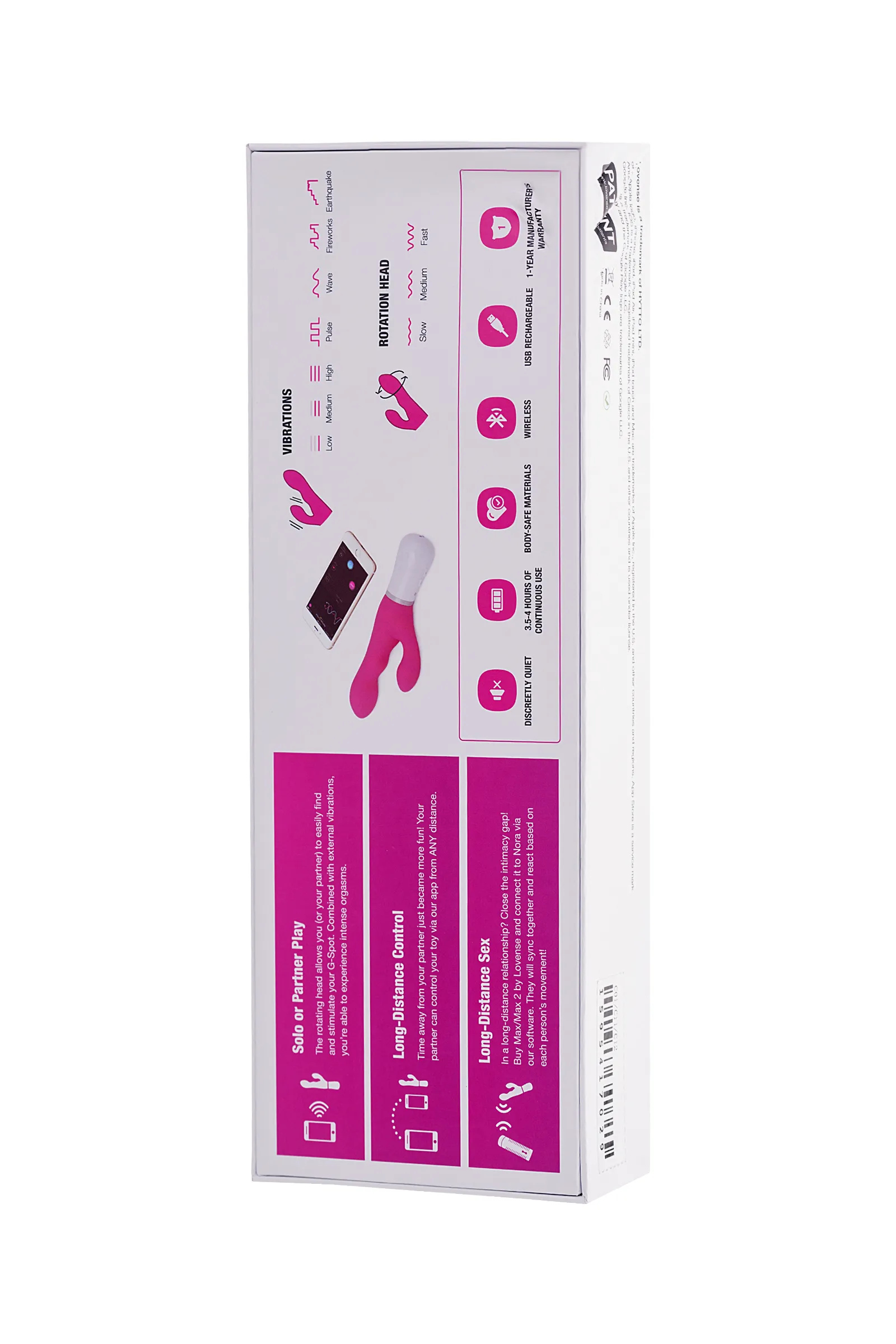 Откройте для себя удивительный мир наслаждения с вибратором-кроликом Nora от Lovense. Это самый мощный управляемый на расстоянии вибратор с двойной стимуляцией и функцией Bluetooth. Компания Lovense является одним из ведущих производителей секс-игрушек. Наслаждайтесь отдельным контролем над стимуляцией точки G и клитора, создавая неповторимые ощущения, которые удовлетворят ваши самые сокровенные желания. Nora обладает специально изогнутым стволом, который мягко стимулирует нужные точки, а глубокое вращение головки обеспечивает интенсивную стимуляцию точки G. Погружная часть вибратора - 12 см. Гибкая вибрирующая клиторальная лапка приспосабливается к разным типам телосложения, обеспечивая идеальное сочетание комфорта и удовольствия. Синхронизируйте Nora с другими игрушками Lovense, такими как Calor или Max 2, и наслаждайтесь интерактивным сексом на расстоянии. Управляйте игрушкой через приложение Lovense Remote, выбирая из неограниченного количества паттернов вибрации и синхронизируя ее с музыкой. Активируйте вибрацию звуком или настройте уровень мощности, исходя из своих индивидуальных предпочтений. отличное подключение в сочетании с множеством функций неограниченное количество паттернов управление с близкого расстояния библиотека с более чем 5000 паттернов синхронизация с музыкой. Nora выполнена из 100% безопасного для тела силикона, обладает шелковистой поверхностью – особенный комфорт в ваших руках. Яркий сочный розовый цвет – визитка игрушек от Lovense. С помощью магнитной USB-зарядки вы можете легко подзарядить игрушку, кроме того, вы устанете первой – длительное наслаждение без подзарядки до 245 минут! В режиме ожидания Nora сохраняет заряд до 120 часов! Освободите свои фантазии и насладитесь уникальным комфортом и стимуляцией с вибратором-кроликом Nora от Lovense. Управляйте на расстоянии, создавайте новые интимные связи и погружайтесь в мир бесконечного удовольствия. Что в комплекте: Вибратор-кролик Nora c Bluetooth USB кабель для подзарядки Руководство пользователя Сумка для хранения