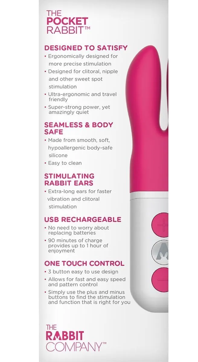 The Pocket Rabbit - это клиторальный мини-вибратор от компании The Rabbit Company, изготовленный из высококачественного и бесшовного медицинского силикона. Вибратор оснащен двумя мощными независимыми двигателями, которые отвечают за шесть бесшумных функций вибрации и пульсации. Специальный кончик в виде ушек обхватит Ваш клитор, дразня и щекоча его, пока Вы не достигните самого сладкого мгновенья! Такую компактную интимную игрушку удобно брать с собой в дорогу и получать удовольствие в любое время. Также The Pocket Rabbit может стать прекрасным подарком для близкого человека!