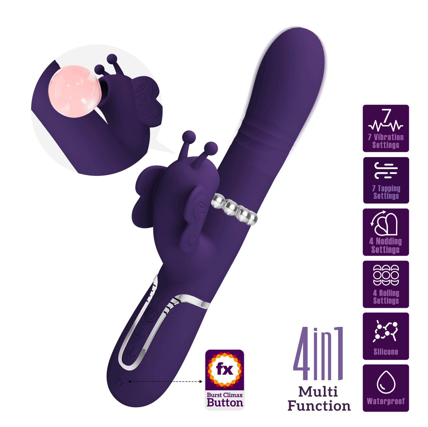 Вибратор имеет 7 настроек вибрации, 7 настроек постукивания и 4 настройки сгибания. Все эти функции могут работать вместе, чтобы доставить удовольствие. Благодаря одному ряду жестких шариков, которые движутся вверх и вниз в захватывающем интимном массаже, вы наслаждаетесь тремя настройками скорости, пока они неуклонно трутся о вашу точку G. Для усиления удовольствия нажмите кнопку Burst Climax, чтобы исследовать ваши невероятные и потрясающие оргазмы