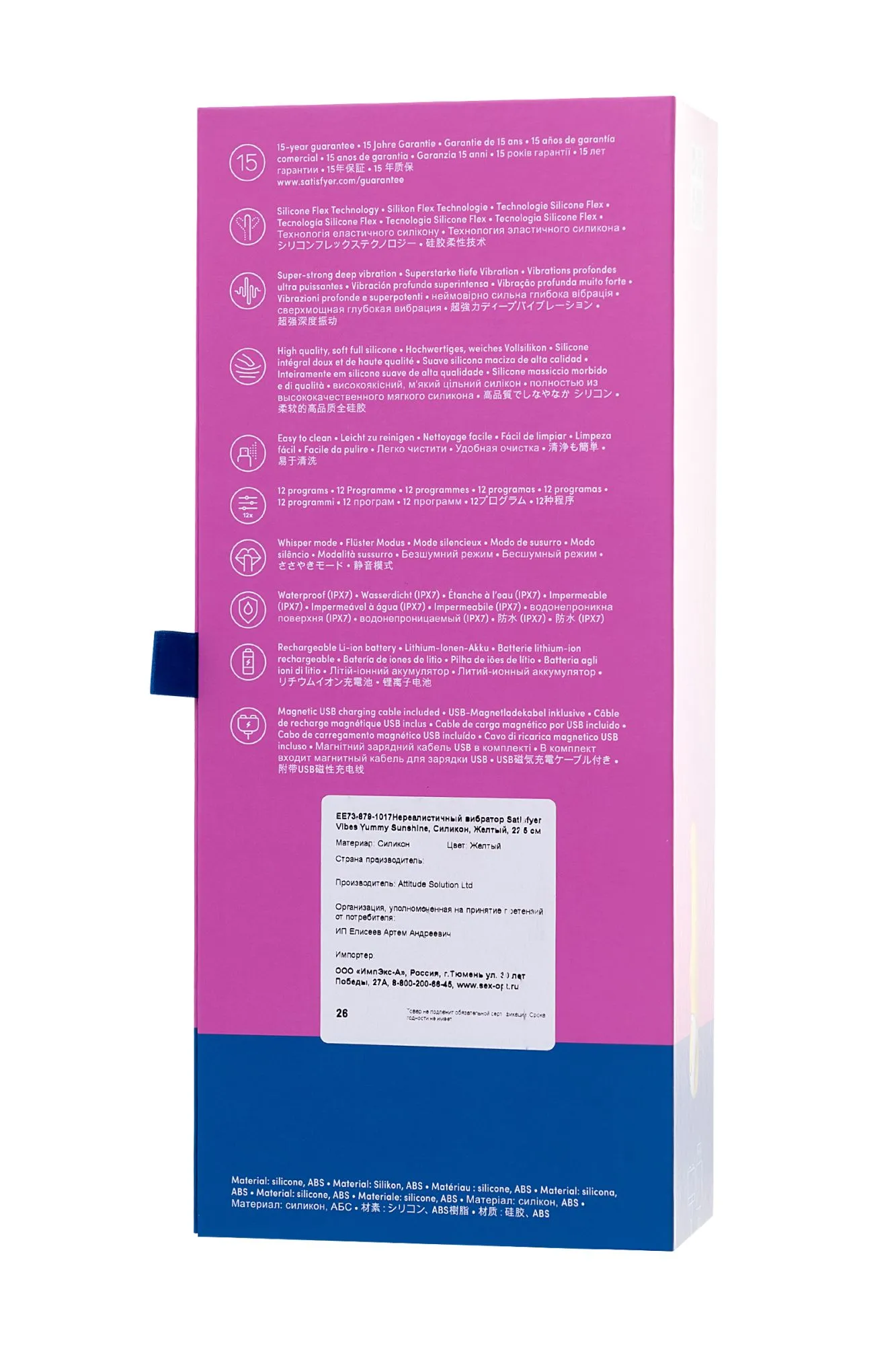 Озорной цвет, дразнящие воображение рельефы, гибкий ствол, 2 мощных мотора и яркая способность безукоризненно стимулировать точку G — нереалистичный вибратор Satisfyer Vibes Yummy Sunshine поднимает настроение и заставляет сиять ваше солнце. Давайте посмотрим, как он это делает. Плавно изогнутая головка и гибкий ствол соблазнительно массируют точку G и повышают градус возбуждения до рекордных отметок. Широкое основание ствола с ощутимым выступом уделяет должное внимание входу во влагалище, усиливая ваше наслаждение. Рельефные волны на стволе дополнительно прорабатывают чувствительные зоны. Шелковистый на ощупь силикон мощно и объемно передает 12 программ головокружительной вибрации, чтобы вы смогли прочувствовать каждый оттенок интимной игры — от игривой прелюдии до энергичной разрядки. 2 мотора идеально точно распределяют сильную вибрацию по всей длине игрушки, помогая датчикам удовольствия зашкаливать от накатывающих эмоций. Полная водонепроницаемость позволяет вибратору сиять для вас не только в спальне, но и в бодрящем душе или расслабляющей ванне. Эргономичная ручка-кольцо со встроенной панелью гарантирует комфортное управление легким нажатием кнопки. Satisfyer Vibes Yummy Sunshine — пусть ярче светит солнце!