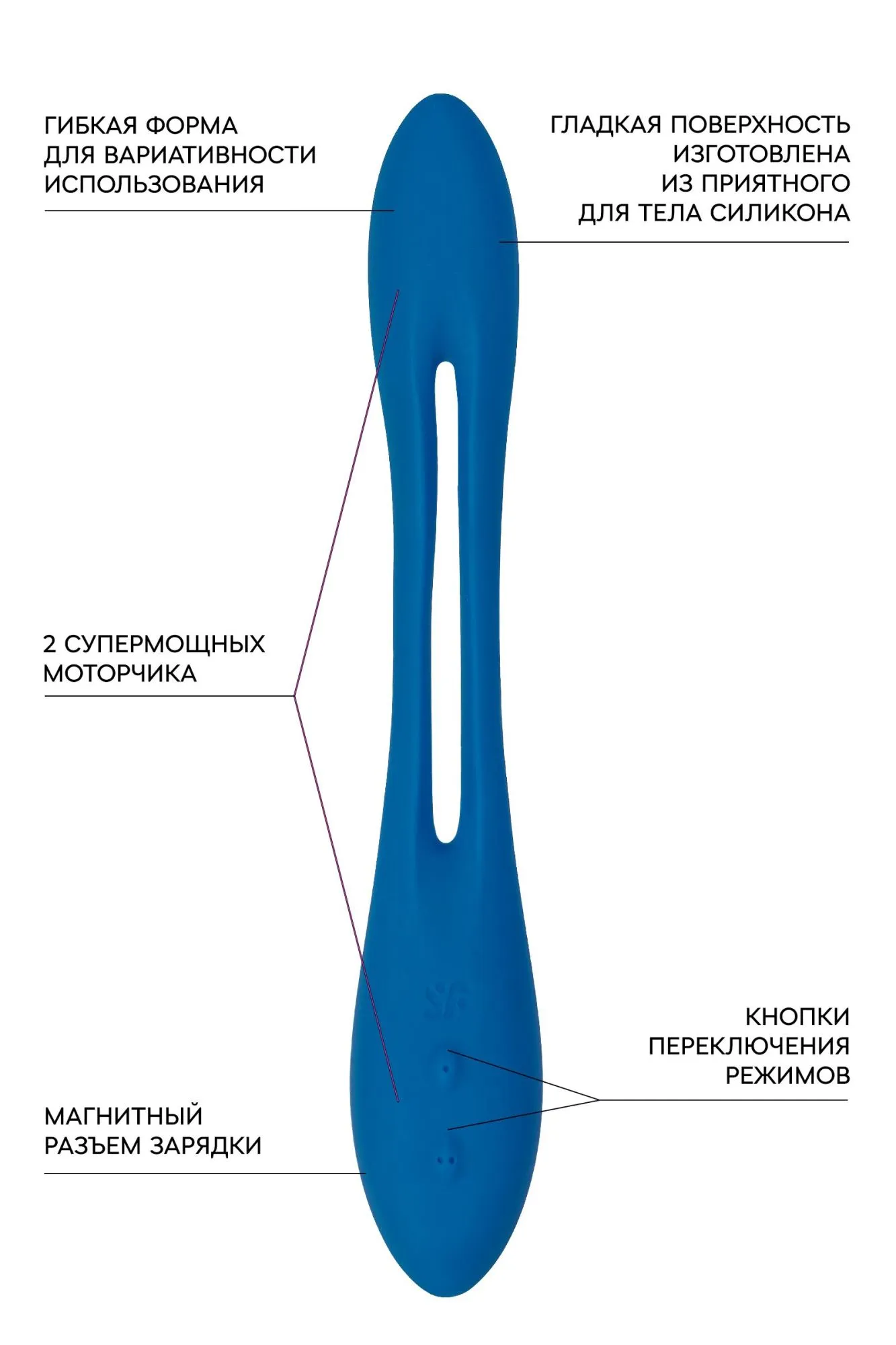 Мультифункциональный гибкий унисекс-вибратор Elastic Game от Satisfyer существенно расширяет возможности сексуального удовольствия в соло игре и паре. Благодаря гибкому корпусу вибратор можно использовать в качестве накладного вибратора, кольца для пениса или парного вибратора. Elastic Game способен подстроиться под индивидуальные особенности тела. Регулируемое положение позволяет зафиксировать и использовать вибратор в любом положении – прямо, сгибать, раздвигать, накладывать, вставлять и делать все, что придет вам в голову. Используйте его как классический погружной вибратор, кольцо для пениса, для стимуляции сосков, или согните его в U-образную форму парного вибратора – более 14 вариаций использования. 2 мощных независимых мотора управляются отдельно, каждый мотор имеет 7 ритмов вибрации и 3 уровня интенсивности. Отдельно управляемые двигатели можно комбинировать друг с другом, обеспечивая 100 возможных комбинаций вибрации. Переключение режимов и двигателей осуществляется с помощью кнопок на корпусе. Элегантный дизайн с небольшим рельефом идеально подходит в качестве первой игрушки для начинающих и для опытных пар. Ребристый конец усиливает внешнюю стимуляцию, а более узкий наконечник обеспечивает точечный массаж зоны G. Шелковистое силиконовое покрытие — фирменный знак Satisfyer, тактильно нежный и приятный на ощупь. Elastic Game позаботится о самых чувственных прикосновениях даже в ванной и душе. Благодаря водонепроницаемости IPX7 игрушку можно погружать под воду до 30 минут. Чтобы получить максимум удовольствия и сохранить материал в наилучшем виде, рекомендуется пользоваться качественной смазкой на водной основе. После использования обязательно очищайте стимулятор теплой водой со специальными бактерицидными спреями для интимных товаров. Особенности: Супер гибкий вибратор, способный подстроиться под любую анатомию Простое управление двумя кнопками. 2 мощных мотора и более 100 комбинаций вибрации. Насыщенный синий цвет и мягкий, эластичный силикон без запаха, без аллергенов и вредных для здоровья веществ. 100% водонепроницаемый - IPX7. Перезаряжаемый, магнитный USB-кабель. 15 лет гарантии от производителя.