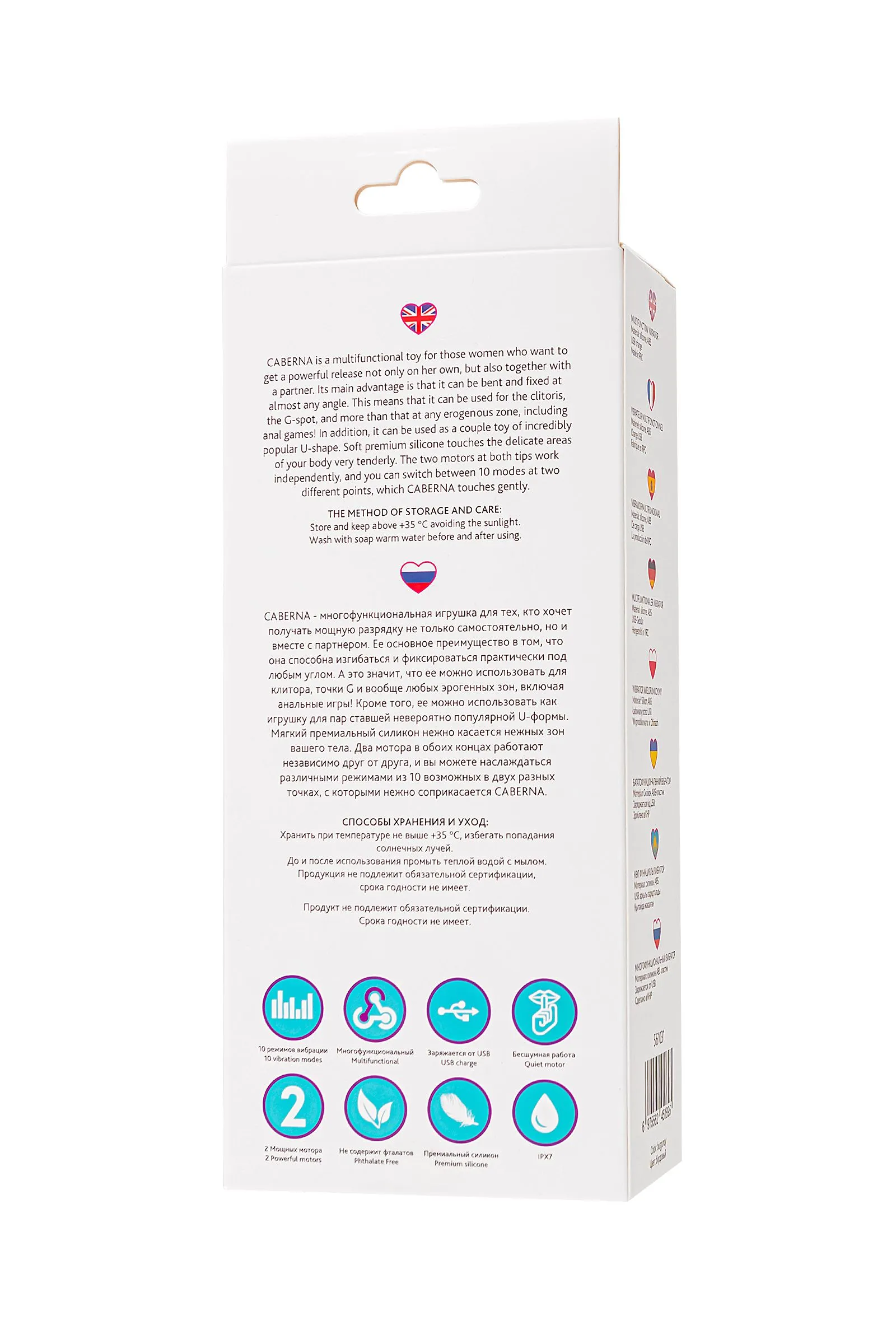 CABERNA – это не просто игрушка, это настоящий кайф для тех, кто ищет незабываемые ощущения в постели. Эта многофункциональная игрушка позволяет получить мощную разрядку не только в одиночку, но и вместе с партнером. Благодаря ее гибкости и возможности фиксации под любым углом, вы сможете наслаждаться стимуляцией клитора, точки G и других эрогенных зон, включая анальные игры. CABERNA от бренда L`Eroina выполнена из мягкого и премиального силикона, который нежно касается вашей кожи, придавая особую чувственность и комфорт. Шелковистое бесшовное покрытие из силикона делает использование игрушки не только гигиенически безопасным, но и тактильно приятным. Игрушка оснащена двумя моторами, которые работают независимо друг от друга. Вы сможете выбрать один из 10 возможных режимов в двух разных точках, чтобы наслаждаться максимальным удовольствием. Кроме того, CABERNA – идеальная игрушка для пар, которые хотят попробовать что-то новое и удивительное в своей сексуальной жизни. Ее можно использовать в популярной U-форме, что обеспечивает непередаваемые ощущения для обоих партнеров. Еще одна “фишка” игрушки – пульт дистанционного управления. Можно управлять игрой самостоятельно, а можно доверить это своему партнеру с помощью пульта. В этом случае эффект неожиданности добавит пикантности ощущениям. Чтобы испытать весь спектр удовольствия, возьмите игрушку с собой в душ, ванну и бассейн. Водонепроницаемость уровня IPX7 позволяет получать удовольствие в воде до 30 минут. Материал - силикон 10 режимов вибрации (бесшумный мотор) Дистанционное управление - пульт Общая длина 20 см Водонепроницаемость - IPX7 Магнитная USB-зарядка (кабель в комплекте) Время зарядки - 3 часа Время использования до 60 минут