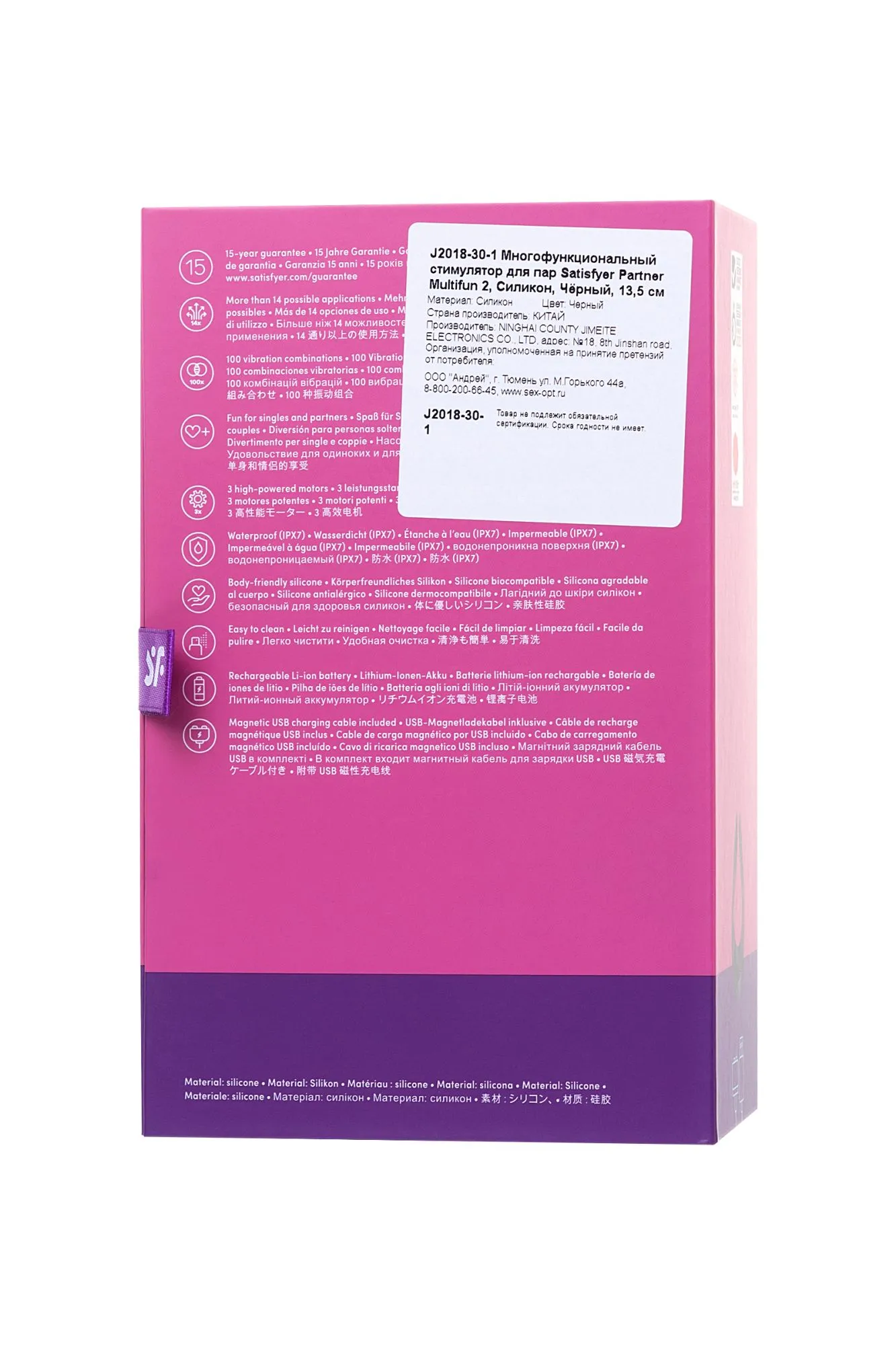 Многофункциональный стимулятор для пар Satisfyer Partner Multifun 2 придает интимной жизни буйство ощущений — он может заменить сразу 4 секс-игрушки, радует 14-ю вариантами применения и предлагает более ста сногсшибательных комбинаций, которые только и ждут, пока вы откроете их для себя. Неважно, будет ли Multifun 2 сверху, снизу или сбоку — этот соблазнительный умелец искусно встроится во все ваши любовные игры. Он равномерно распределит каждый из десяти режимов вибрации с помощью трех моторов с независимым управлением и с легкостью синхронизируется под ваше удовольствие. Попробуйте! Стимулятор для пар. Во время интимной сессии установите широкую сторону девайса на клитор, а «ушки» направьте на мошонку или член партнера. Волнующий массаж — лучшая прелюдия перед громким оргазмом. Массажер внешних эрогенных зон. Проведите трепещущими кончиками игрушки по шее, груди, соскам, бедрам, клитору, половым губам, мошонке, члену партнера и другим чувствительным местам. Увидите, они ответят на нежные импульсы мгновенным возбуждением. Вибратор для точки G. Пульсирующие «пальчики» Multifun 2 имеют идеальную форму и длину для пробуждения загадочной G-точки. Просто введите их внутрь и отдайтесь наслаждению. Игрушка для экспериментов в душе. Стимулятор обладает полностью водонепроницаемой поверхностью, с ним вы легко сможете взбодрить свой утренний душ или расслабиться в вечерней ванне с ароматной пенкой. Кольцо для члена. Наденьте девайс на член партнера. Массажер порадует плотным обхватом, а вибрация усилит эмоции от стимуляции и приведет к более яркой разрядке. Согласитесь, любовь — это когда всем делятся друг с другом, так почему бы не поделиться оргазмом от Multifun 2?