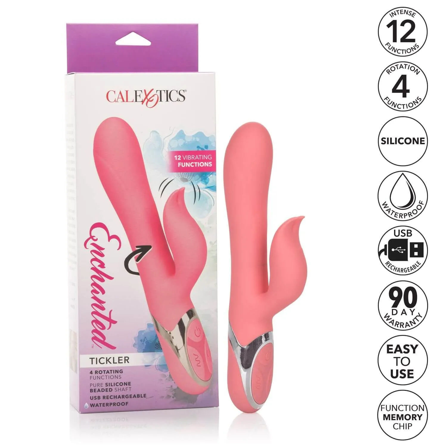 Enchanted Tickler выполнен из качественного медицинского силикона. Этот материал полностью гипоаллергенен и не содержит фталатов. Управление вибратором происходит при помощи трех кнопок, расположенных в основании. А благодаря функции запоминания последнего использованного режима, Вы сможете начать с того момента, на котором остановились в прошлый раз. Вибратор оснащен перезаряжаемым аккумулятором, а также LED индикатором уровня заряда.